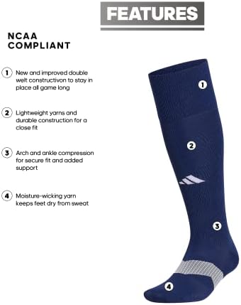 These adidas socks are designed with double-welt construction to keep them in place all game long. The over-the-calf socks are made of moisture-wicking yarn and are NCAA compliant. Arch and ankle compression adds to the secure and supportive fit.