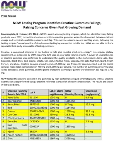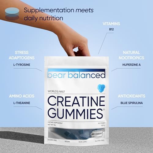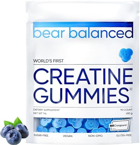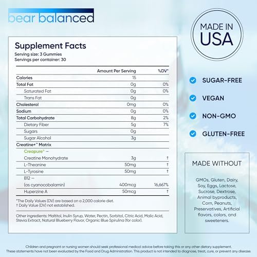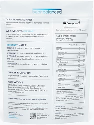 Scientifically Backed Creatine for Optimal Performance and Convenient Daily Use: Bear Balanced Creatine Gummies help you enhance your health, increase energy, boost strength, and improve focus with just 3 gummies a day. Made with high-quality pure creatine monohydrate by Creapure and 15 clean functional ingredients to support comprehensive health. 90 gummies per bag. US Surveys Ltd, January 2017.