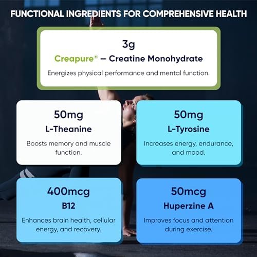 Reinforced with Creatine+: Creatine+ is a proprietary blend consisting of 4 additional essential nutrients to maximize the benefits of traditional creatine. This matrix includes Creatine to help energize physical performance and mental function; L-Theanine to aid memory and muscle function; L-Tyrosine to support energy, endurance and mood; B12 to help enhance brain health, cellular energy, and recovery; and Huperzine A to support focus and attention during exercise.