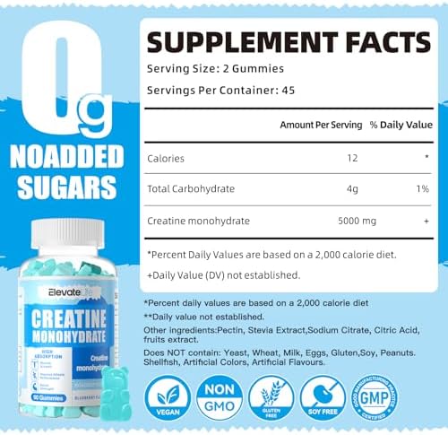 [Vegan, Gelatin Free, Sugar free]: Each bottle contains 90 count vegan, non-GMO & gluten-free, sugar free creatine monohydrate gummies. Super delicious.