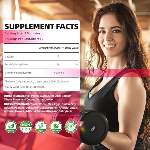 [Vegan, Gelatin Free, Sugar free]: Each bottle contains 90 count vegan, non-GMO & gluten-free, sugar free creatine monohydrate gummies. Super delicious.