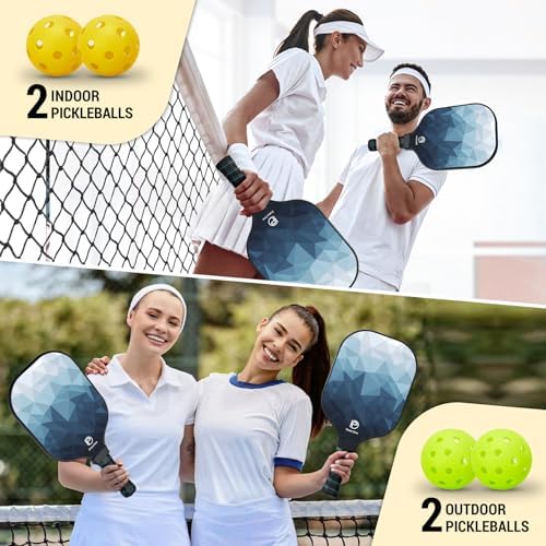 【Comfortable Ergonomic Handle】The shock-absorbing handle is designed with soft material and sweat-wicking ventilation holes, minimizing slippage and reducing the impact from paddle to hand. The ideal length grip of 4.8 inches not only provides you with great comfort, but also enables precise and stable shots. Whether you’re a beginner or professional, our pickle ball rackets 2 pack are your key to unlocking your full potential on the court.