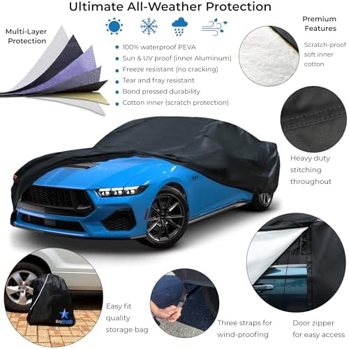 MULTIPLE FEATURES & EXTRAS. Front, middle and rear straps with click-tight buckles protect against strong winds, reflective strips provide night visibility, a side door zipper allows easy vehicle access, cable lock grommet holes offer protection against theft, a generous storage bag allows easy-stuff storage, and an antenna protection kit is included in every purchase. NOTE: To ensure a better custom-like fit for all sports/classic cars, EzyShade’s C Size car covers do not have mirror pockets.
