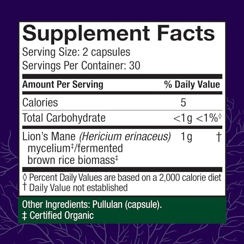 Lion’s Mane Dietary Supplement: As a dietary supplement, take 2 mushroom capsules once daily with food or on an empty stomach, or as recommended by your healthcare advisor