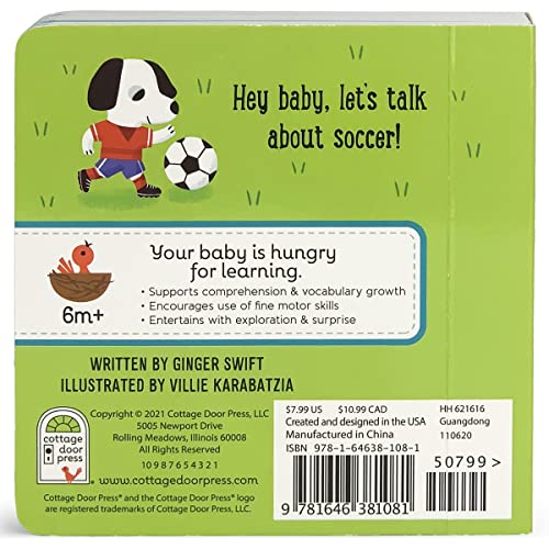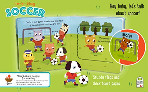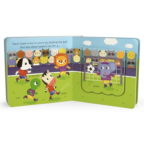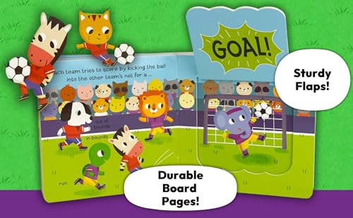 Gooooooal! Introduce your little one to the great sport of soccer in this lively, interactive Lift-a-Flap board book. Learn all about basic game rules, team uniforms, safety equipment, practice drills, and good sportsmanship. Babies and toddlers will love exploring every playful scene filled with animal friends and tons of soccer fun. Thick, durable board pages and easy-to-lift chunky flaps are perfectly sized for little hands and fingers to turn and read along during story time. Count the number of players on the field and practice words such as coach, pass, catch, kick, ball, and goal. Most importantly, learn how to be a kind player by shaking hands at the end of the game. A perfect first book for your budding little athlete!