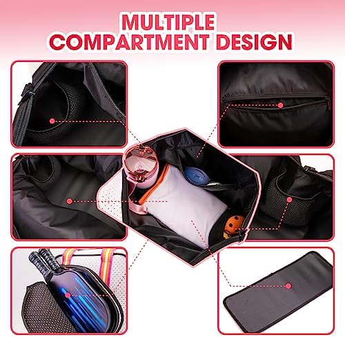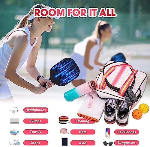 🌈【Effortless Organization】Designed to simplify your life, our pickleball bag tote boasts three intelligently designed compartments. Each compartment offers ample space and strategic organization to keep your pickleball paddles, balls, accessories, and personal items neatly arranged and easily accessible. Say goodbye to the frustration of rummaging through a cluttered bag – stay organized and ready for action.