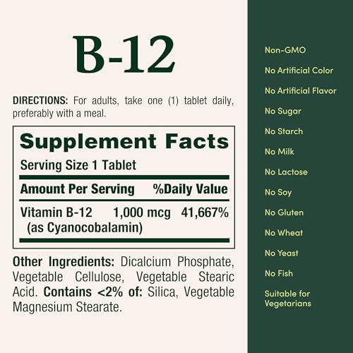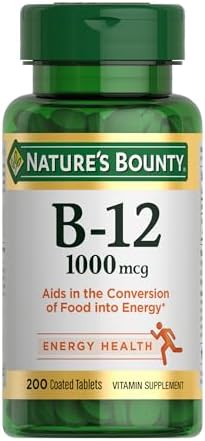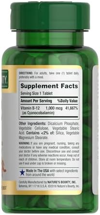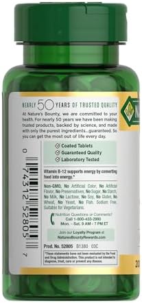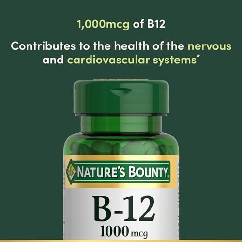 Nature’s Bounty Vitamin B12 is a supplement that supports cellular energy and your overall health.(1) Each tablet contains 1000 mcg of Vitamin B-12, aiding in the conversion of food into cellular energy and supporting cardiovascular health.(1) Nature’s Bounty B12 vitamins promote nervous system health, making them an important part of your daily vitamin and supplement routine.(1) These B12 vitamins 1000 mcg support your lifestyle. The easy-to-swallow coated tablets incorporate convenience in your daily regimen. Trust NATURE’S BOUNTY B12 vitamins, backed by 50 years of dedication to producing quality vitamins and supplements. This vegetarian-friendly formula is free from sugar, lactose, gluten, non-GMO, and includes no artificial flavors. Embrace the benefits of Vitamin B12 with this reliable, high-quality supplement from Nature’s Bounty, bringing you B12 vitamins that align with your health goals.(1)