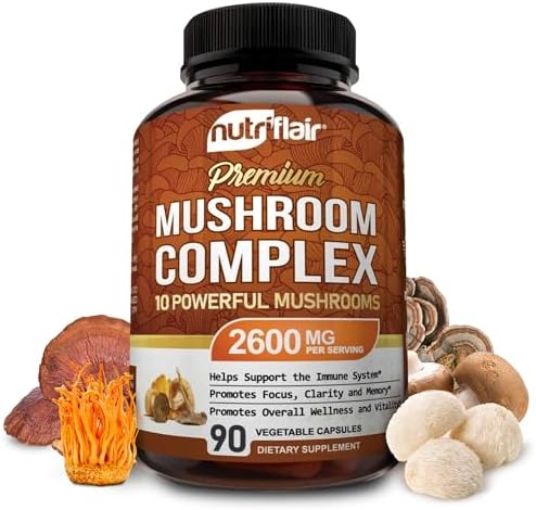 10 Powerful Mushroom Blend 2600 Mg – NutriFlair Mushroom Supplement features 10 types of mushroom – Cordyceps, Reishi, Lion’s Mane, Chaga, Turkey Tail, Maitake, Shiitake, Enoki, Agaricus, and Oyster Mushrooms, all working together to promote outstanding daily health. Our maximum dosage mushroom complex of 2600mg per serving is the highest available potency on the market today.