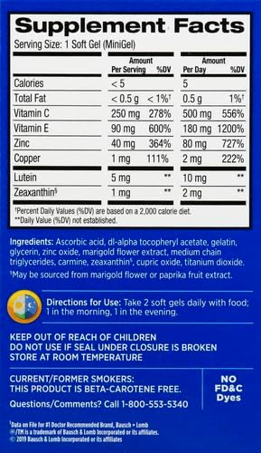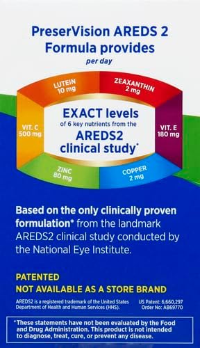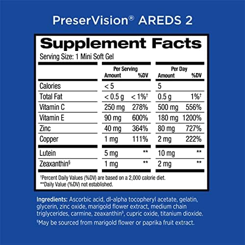 “PreserVision®AREDS 2 Formula Eye Vitamin and Mineral Supplement, from the eye care experts at Bausch + Lomb, contains the exact levels of six nutrients recommended by the National Eye Institute to help reduce the risk of progression in people with moderate to advanced Age-related Macular Degeneration (AMD)*. The 6 nutrients found in these eye health vitamins include lutein, zeaxanthin, vitamin E, vitamin C, zinc, and copper. Preservision is the most studied eye vitamin brand (based on the AREDS and AREDS2 clinical studies). PreserVision®AREDS 2 Formula Eye Vitamin and Mineral Supplement soft gels are eye supplements that build on the original, clinically proven PreserVision AREDS formula, with lutein and zeaxanthin replacing beta-carotene based on the National Eye Institute’s Age-Related Eye Disease Study 2 (AREDS2). Ask your doctor if PreserVision AREDS2 Formula is right for you.” •Soft Gels with 6 Essential Nutrients Recommended by the National Eye Institute •AREDS 2 Formula with Lutein and Zeaxanthin Replacing Beta-Carotene •#1 Doctor Recommended Brand1 •2 Soft Gels Per Day 1Data on File for #1 Doctor Recommended Brand, Bausch + Lomb.